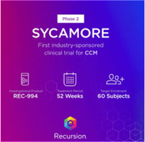 A empresa Recursion Pharmaceutics anuncia a admissão de seu primeiro paciente com cavernoma cerebral na Fase II do Projeto SYCAMORE, um ensaio clínico para avaliar a droga oral REC-994 no tratamento de cavernoma cerebral.