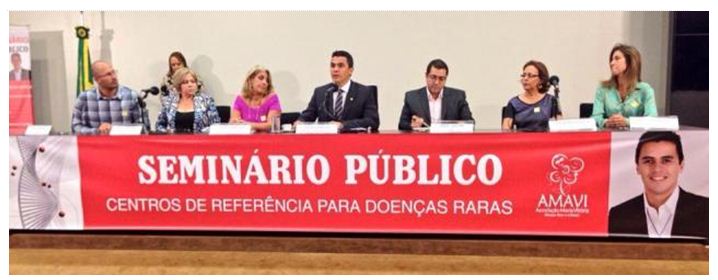 Participaram do seminário, a presidente da Amavi, Lauda Santos, a diretora do Centro de Genética da SES-DF, doutora Teresinha, o representante do Observatório de Doenças Raras da Universidade de Brasília, professor Natan, a doutora Mara Santos, geneticista do Hospital Universitário de Brasília, doutor Gerson, da Secretaria de Estado da Saúde do Distrito Federal, e a presidente da Aliança Cavernoma do Brasil. Além dos parlamentares Alan Rick (PRB-AC), Pr. Eurico (PSB-SP) e Kaio Maniçoba (PHS-PE).