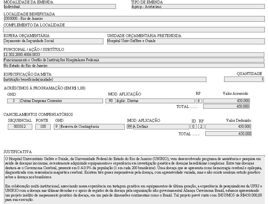 Os testes serão realizados Hospital Universitário Gafrée e Guinle, da Universidade Federal do Estado do Rio de Janeiro (UNIRIO), associando a experiência da equipe da UNIRIO em testagem genética com equipamentos de última geração, à experiência de pesquisadores da UFRJ que acompanham coorte de pacientes nas últimas décadas. O cavernoma cerebral destaca-se entre as doenças órfãs de apoio oficial por não ser muito rara e estando presente entre 1 a cada 200 brasileiros( 0.4-0.9% na população geral). A doença apresenta-se como hemorragia cerebral e epilepsia, sendo geralmente diagnosticada com a ressonância magnética cerebral. Existem três genes responsáveis pela doença, com agressividade variada, e não existe estudo genético amplo sobre a doença nos brasileiros.