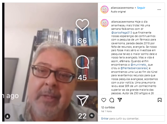 Há uma semana falávamos com dr @carlosfraga313 que finalmente nossas esperanças de continuarmos com a pesquisa de um fármaco para cavernoma, parada desde 2018 por falta de recursos, avançaria. Se nosso país fosse mais sério e investisse em pesquisa talvez o maior sonho dele e nosso teria avançado. Mas a vida é assim, efêmera. Quando enfim encontramos o @munirneto_ que criou a @frentedoencasrarasrj e encontramos uma luz ao fim do túnel para levantarmos recursos para que nossa pesquisa avançasse, acordamos com a pior notícia. Uma pneumonia levou esse SER de um conhecimento superior ao da grande maioria das pessoas. Autor de 250 artigos e 26 patentes nacionais e internacionais. Dentre essas patentes uma era para CAVERNOMA CEREBRAL. Entusiasta, generoso, competente! Em nossa primeira reunião em 19 de fevereiro de 2014 onde eu @selvachaves sonhava em criar a @aliancacavernoma ele estava presente. Em nossa primeira live em 28 de fevereiro 2024 em celebração ao dia mundial de doenças raras, ELE estava presente. A nós restão as lembranças e a certeza de que continuarei na luta pelas pesquisas! E fica a mensagem “Quereis conhecer o segredo da morte. Mas como podereis descobri-lo se não o procurardes no coração da vida?